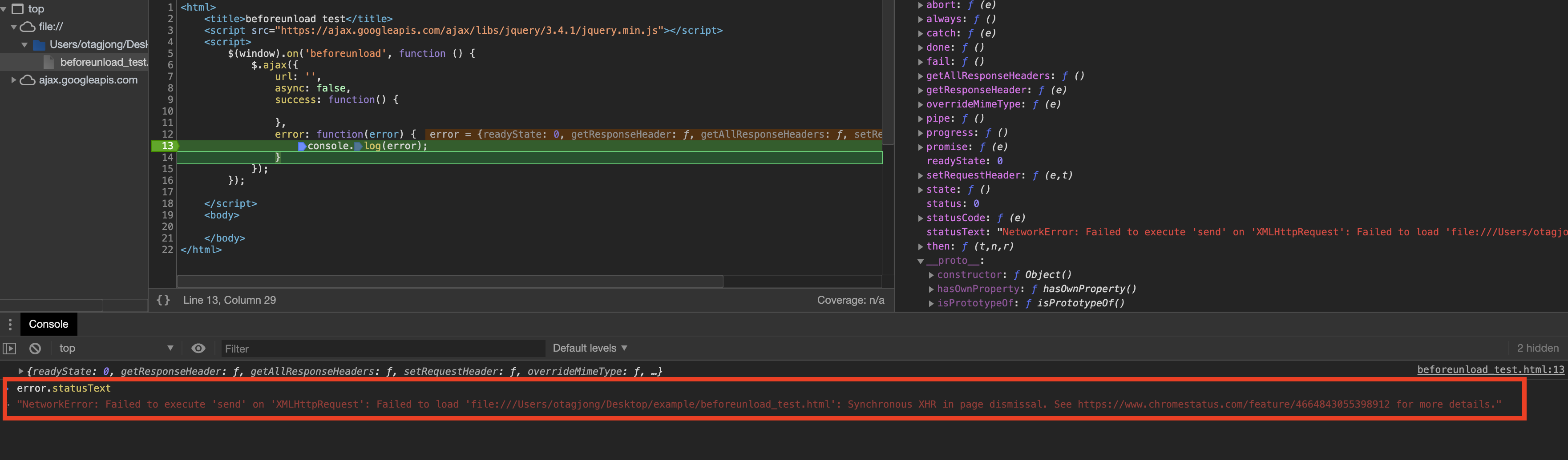 크롬 beforeunload XMLHttpRequest 요청 정책 : https://www.chromestatus.com/feature/4664843055398912