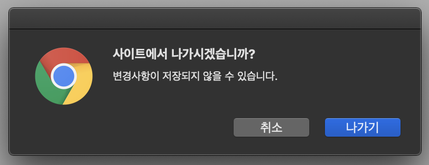 위와 같은 방식에서 크롬에서는 종료시에 confirm dialog가 출력되기는 하나 문구가 아래와 같은 dialog가 나와야하지만,