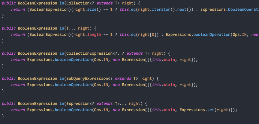 in 메서드에 들어갈 수 있는 파리미터를 살펴보니 Expression을 가변 인자로 받고 있는 것을 볼 수 있다.