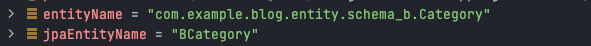 Caused by: org.hibernate.DuplicateMappingException: The [com.example.blog.entity.schema_a.Category] and [com.example.blog.entity.schema_b.Category] entities share the same JPA entity name: [Category] which is not allowed!