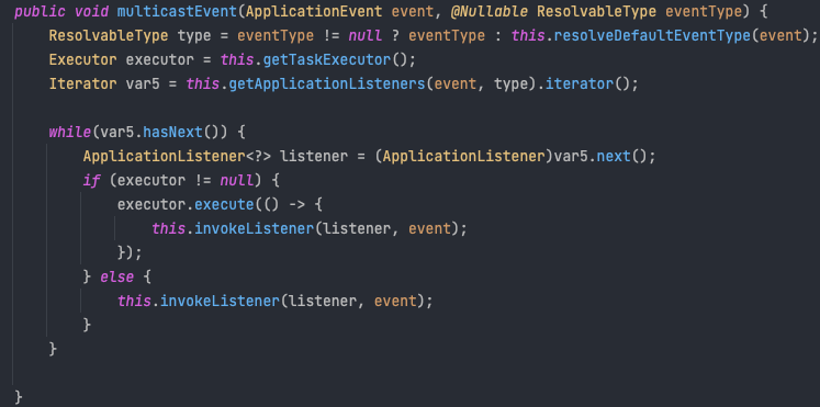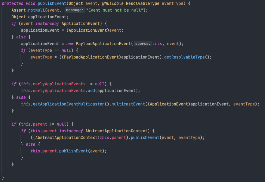 ApplicationEventPublisher의 publishEvent를 찾아가다 보면 아래 메서드를 만난다.