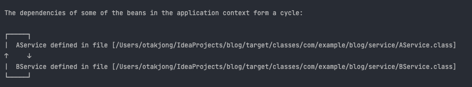 이런 경우에 각 서비스 클래스를 빈으로 만들면서 서로를 참조하기 때문에 다음과 같은 오류를 만나게 된다.