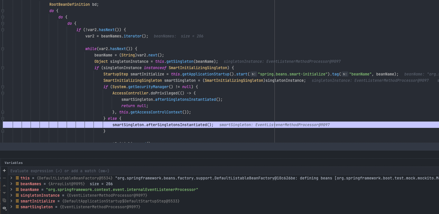 org.springframework.context.event.internalEventListenerProcessor bean 이름을 가진 EventListenerMethodProcessor 클래스를 만나면서 싱글톤 인스턴트로 만들어지고 난 후의 작업이 실행된다.