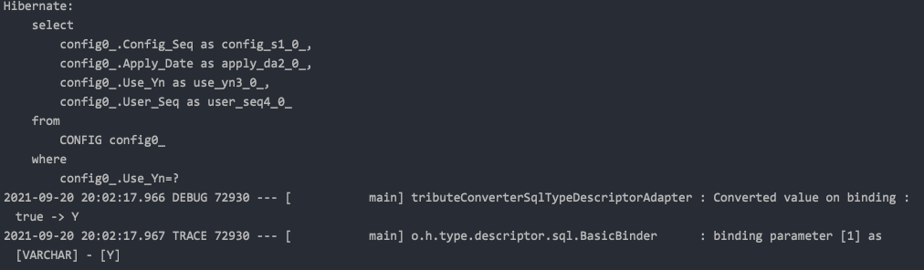CONFIG 테이블에 BooleanToYNConverter를 사용하는 칼럼이 있어, DB값이 Y라면 엔티티에는 true, 반대의 경우에는 false로 가져올 때, 해당 칼럼을 where 절로 쿼리를 select 할 때, case when 구문으로 true, false를 임의로 주면 파라미터 바인딩이 제대로 되지 않는 현상이다.
