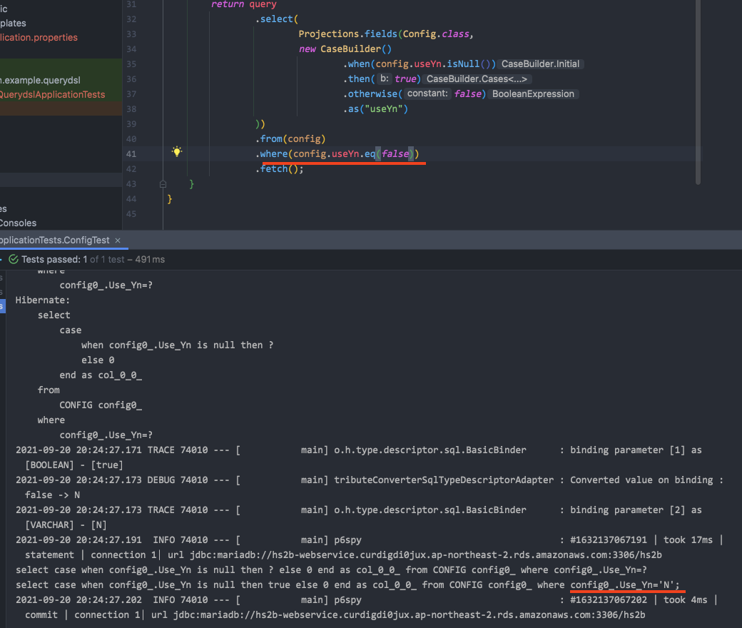 이때, 위와 같은 쿼리를 querydsl로 날리면, 아래와 같이 Use_Yn = 'Y'로 컨버트 되어 쿼리가 실행되게 된다.