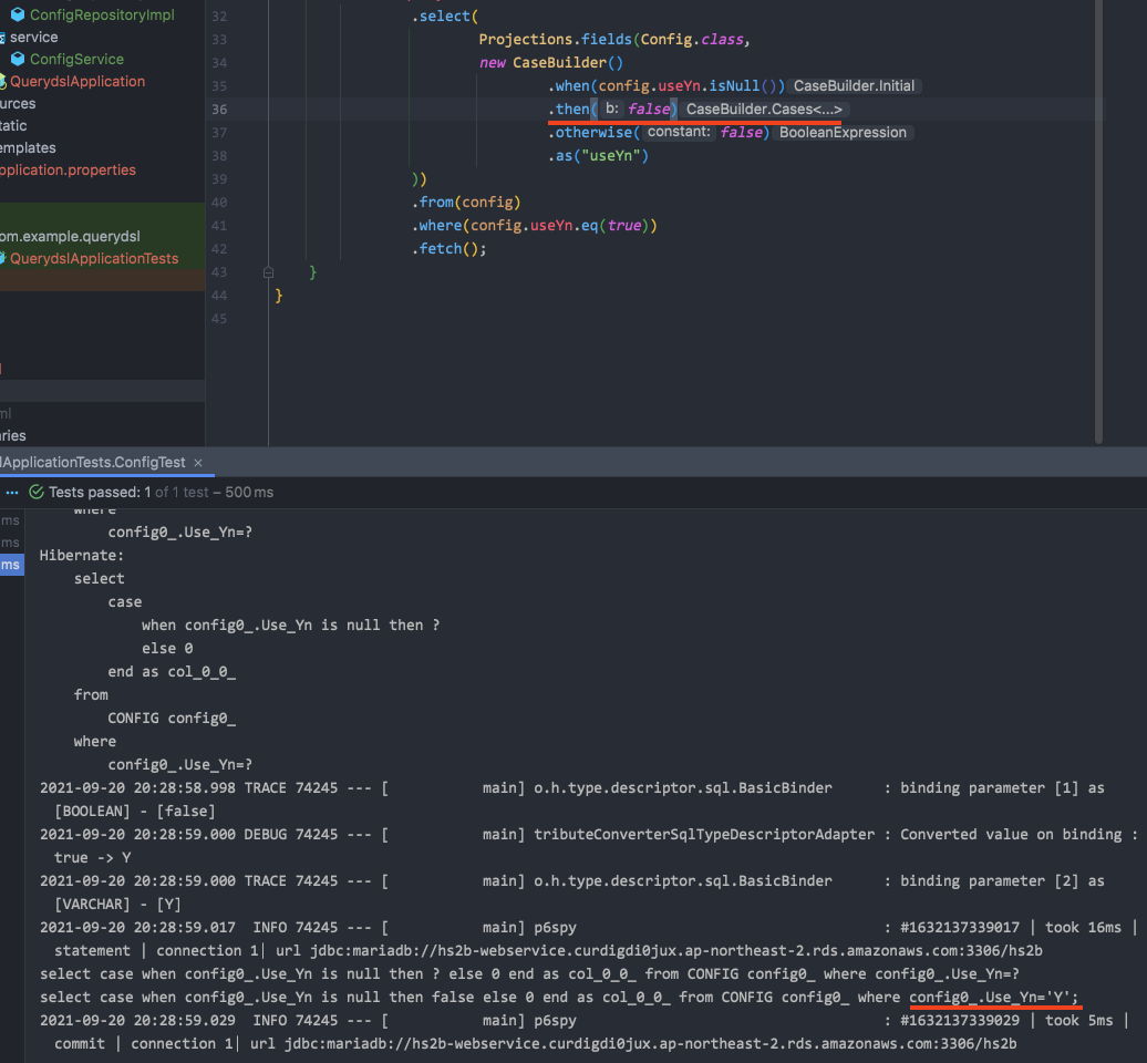 아무 설정 바꾸지 않은 채로, case builder에서 true만 false로 바꾸었더니 정상적으로 파라미터가 컨버터가 적용되어 Y값으로 바인딩되어 쿼리가 실행되는 것을 확인할 수 있다.